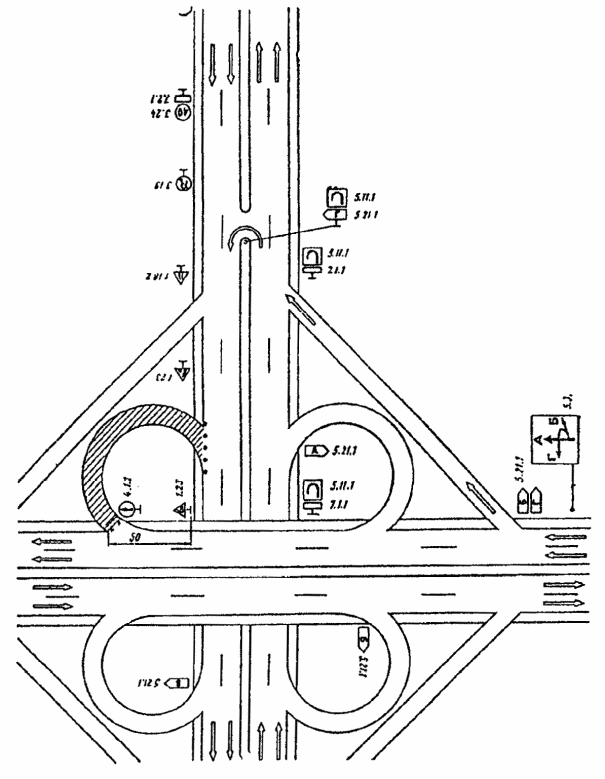 Рис. 3.23. Организация движения и ограждение места дорожных работ при закрытии левоповоротного съезда пересечения в разных уровнях с устройством разворота на одной из дорог