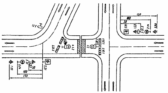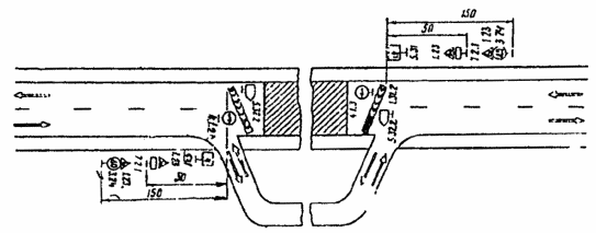 Рис. 3.30. Организация движения при производстве дорожных работ на всей ширине проезжей части и направлением потока транспорта в объезд по существующим дорогам