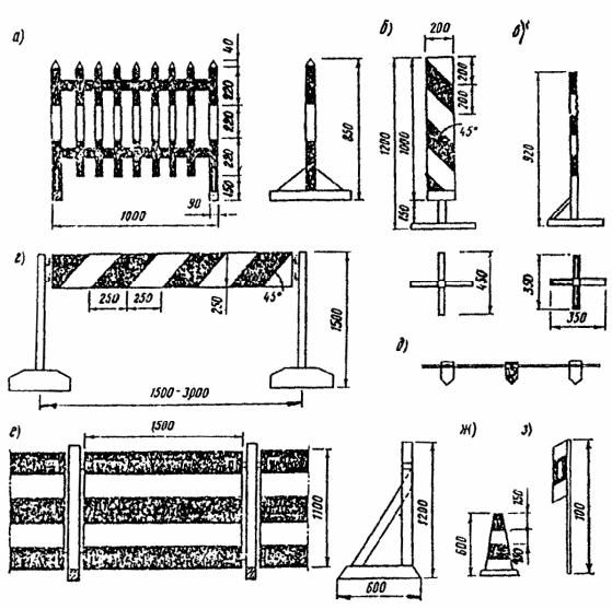 а - штакетный барьер; б - направляющая веха; в - деревянная стойка; г - барьер с деревянной или металлической перекладиной; д - сигнальный шнур с цветными флажками; е - инвентарный щит; ж - направляющий конус; з - сигнальный флажок