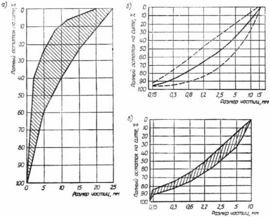 Рис. 1. Гранулометрический состав заполнителей с максимальными размерами зерен 25 мм (а), 15 мм (б) и 20 мм (в):