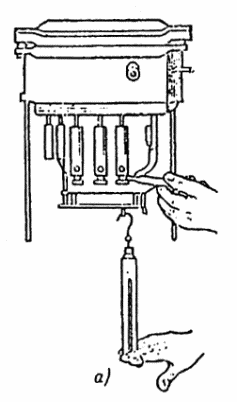 а — проверка нажатия главных контактов с помощью динамометра и бумажной полоски;