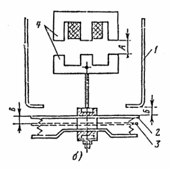 б — проверка контролируемых зазоров; 1 — неподвижный контакт; 2 — подвижный контакт в отключенном положении; 3 — провал подвижного контакта после включения; 4 — магнитная система.