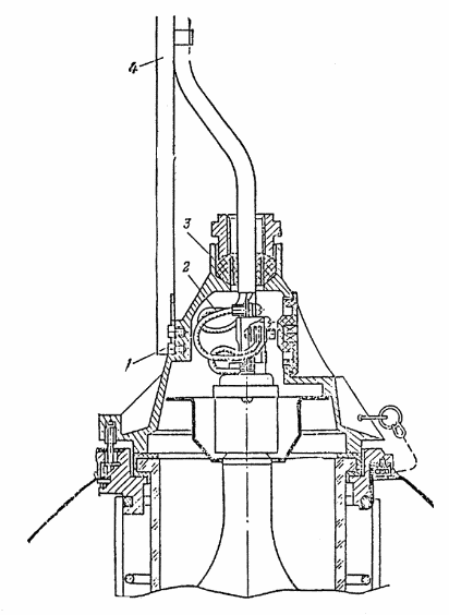 б) отвернуть ключом два болта, крепящих нажимную муфту 1 (рис. 84 — 86), снять ее и вынуть из гнезда ввода резиновое кольцо 2;