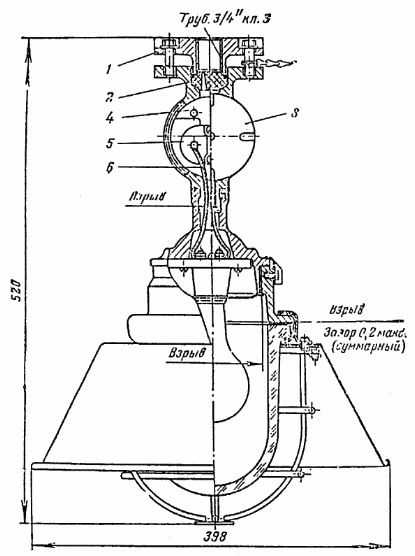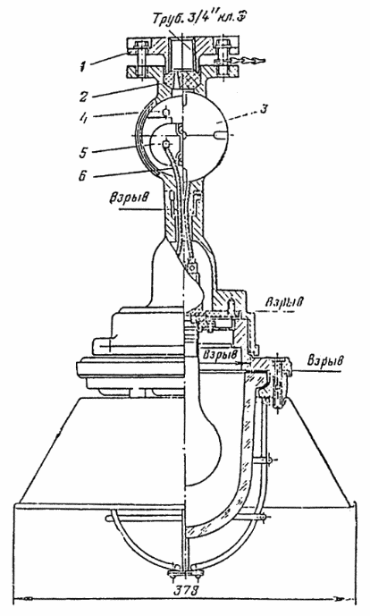 1 ¾ нажимная муфта; 2 ¾ резиновое уплотнительное кольцо; 3 ¾ крышка вводного устройства; 4 ¾ заземляющий зажим; 5 ¾ контактная колодка; 6 ¾ провод марки ПРКС.