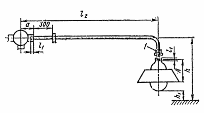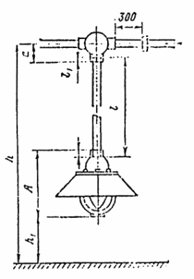 где С = А + а ¾ 2l1; 1 — длина трубы; h — отметка оси трубопровода (дается на чертеже); h1— отметка подвеса светильника (дается на чертеже); А — высота светильника; а — расстояние от оси коробки до конца патрубка (67 мм), мм; l1 — длина короткой резьбы (для труб 3/4" — 16 мм).