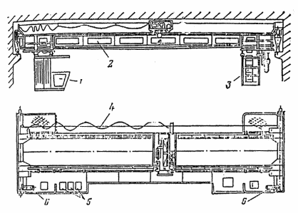1 ¾ кабина управления; 2 ¾ мост; 3 ¾ кабина обслуживания токоподвода; 4 ¾ токоподвод тележки; 5 ¾ станция управления; 6 ¾ электродвигатели передвижения моста.