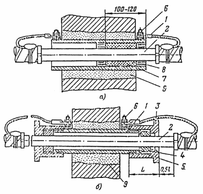а — с уплотнительным составом УС-65 (рекомендуемый); б — с сальниковым уплотнением (допустимый); L — длина сальника; 1 — отрезок трубы; 2 — кабель; 3 — сальник;