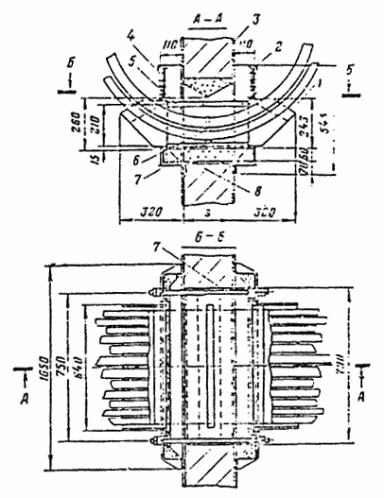 1 ¾ короб; 2 ¾ крышка; 3 ¾ штукатурка; 4 ¾ фасадный щиток; 5 — шпилька; 6 — профиль монтажный; 7 ¾ опорные полосы; 8 ¾ опорные уголки.