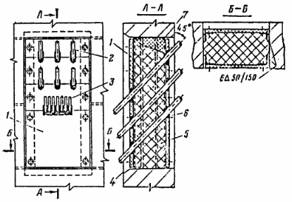 5-39. Проходы группы кабелей (не более 5 шт.) сквозь внутренние стены взрывоопасных зон классов В-I, В-Iа и В-II рекомендуется выполнять аналогично проходам одиночных кабелей в отрезках водогазопроводных труб, предварительно приваренных к металлическим рамам (рис. 12). Типы рам следует выбирать по действующим типовым проектам.