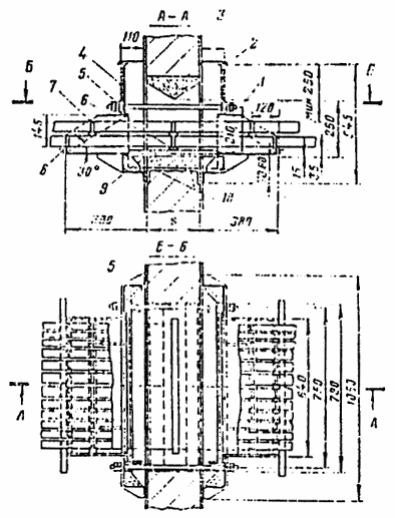 4 — резиновое уплотнительное кольцо; 5 — шайба; 6 — болт заземления; 7 — уплотнительный состав УС-65; 8 — уплотнения из кабельного джута или асбестового шнура; 9 — цементный раствор.