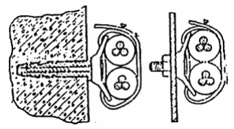 6-21. Свинцовая оболочка кабелей под металлическими скобами или полосками должна быть защищена эластичными изолирующими прокладками (например, поливинилхлоридным пластикатом, электрокартоном и т. п.). Прокладки должны выступать из-под скобок или полосок на 1,5 — 2 мм с обеих сторон. Крепление кабелей с оболочкой из поливинилхлоридного пластиката или из резины на основе полихлоропренового каучука выполняется без прокладок под скобками.