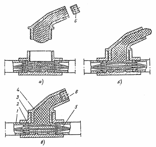 а ¾ заполненные составом крышка и корпус; б ¾ уплотнение состава при завернутой крышке; в ¾ выполненное разделительное уплотнение после полной сборки; 1 ¾ трубопровод; 2 ¾ набивка из джута или асбестового шнура; 3 ¾ корпус; 4 ¾ крышка; 5 ¾ провод;