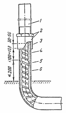 Выполнение такого разделительного уплотнения в трубе, выходящей из пола, допускается при подводе питания к пускателям, электродвигателям, а также при переходе кабеля на открытую прокладку (рис. 29, 30) с обязательным устройством разъемного соединения не далее 30 — 50 мм от верха заполнения составом.