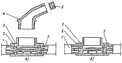 а ¾ крышка с пробкой и корпус с проложенными одножильными проводами и выполненной набивкой из джута; б ¾ корпус с проложенным многожильным проводом ПРТО со снятой хлопчатобумажной оплеткой и выполненной набивкой из джута; 1 ¾ трубопровод; 2 ¾ набивка из джута или асбестового шнура; 3 ¾ корпус; 4 ¾ крышка; 5 ¾ провод; 6 ¾ пробка.