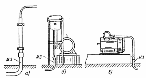 а — выход из пола трубы с кабелем, проложенным открыто; б — выход из пола трубы с кабелем к пускателю; в — выход из пола трубы с кабелем к двигателю; МЗ ¾ место заполнения составом УС-65 в трубе с кабелем для разделительного уплотнения.
