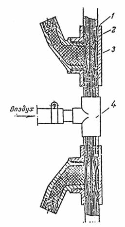 1 — коробка; 2 — джут или асбестовый шнур; 3 — уплотнительный состав УС65; 4 ¾ тройник по ГОСТ 8949-59.