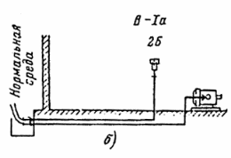 б) в местах перехода трубопроводов из одних взрывоопасных зон в другие одинаковых классов, но содержащих взрывоопасные смеси других категорий или групп, — со стороны зон, имеющих взрывоопасную смесь более высокой категории и группы (рис. 32);