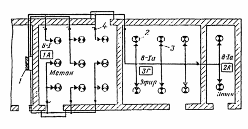 1 ¾ щиток распределительный; 2 ¾ светильник взрывозащищенный; 3 ¾ разделительное уплотнение, выполненное резиновой уплотнительной прокладкой; 4 ¾ разделительное уплотнение, выполненное в коробках КПЛ и КПР.