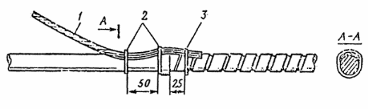 Расплетенные проволоки заземляющего проводника должны быть плотно уложены по оболочке в один ряд, чтобы после припайки проводника сохранилось сечение кабеля (по оболочке), близкое к кругу (разрез А ¾ А).