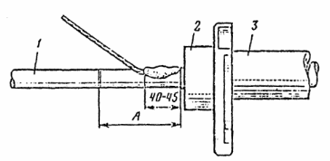 8-44. Наложить на изоляцию каждой жилы бандаж из двух-трех витков ниток или липкой поливинилхлоридной ленты на расстоянии а от конца жилы по данным табл. 7.