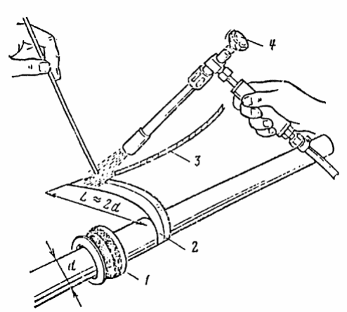 8-27. При применении кабеля с алюминиевой оболочкой в зонах классов В-Iб, В-Iг, В-II и В-IIа облудить оболочку на расстоянии 40 — 45 мм от среза брони, натирая ее припоем А в пламени газовоздушной горелки или паяльной лампы, а затем облудить припоем ПОС-40.
