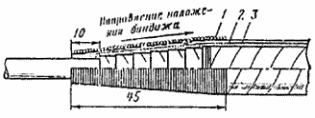 д) наложить на изоляцию с натяжением бандаж из шпагата диаметром 0,8 — 1,0 мм на участке 45 мм, считая от конца изоляции. Наложение бандажа следует начинать от конца изоляции;