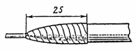 е) герметизировать концы жил кабеля; для этого на концы трубок наложить с натяжением и 50 %-ным перекрытием витков бандаж из липкой поливинилхлоридной ленты на длине 25 мм с перекрытием клинообразного выреза и переходом на оголенную жилу (рис. 49); наложить с натяжением поверх липкой поливинилхлоридной ленты по всей ее длине бандаж из суровых ниток (рис. 50);