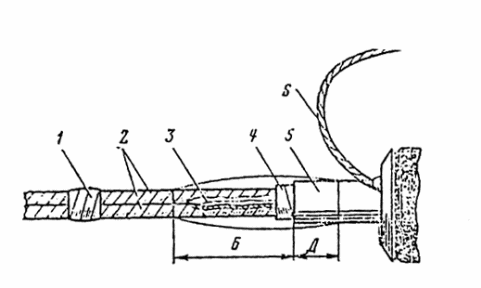 1 ¾ временный бандаж из шпагата или киперной ленты; 2 ¾ жилы, изолированные лентой ПВХ; 3 ¾ состав № 2; 4 ¾ поясная изоляция; 5 . оболочка кабеля; 6 ¾ заземляющий проводник.