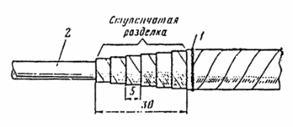 б) снять с конца жилы до бандажа пять верхних слоев изоляции. Остальные слои на участке 30 мм от бандажа снимать ступенями с отступлением на 5 мм (рис. 54);