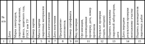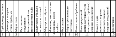 | Трубопровод (номер линии) | Диаметр и толщина стыкуемых труб, мм | Марка стали | Маркировка образца | Место разрушения и вид дефектов в изломе образца | Временное сопротивление, МПа (кгс/см2) | Угол изгиба или просвет при сплющивании, мм | Ударная вязкость, кДж/м2 (кгс м/см2) | Фамилия, имя, отчество сварщика, номер клейма | Регистрационный номер в журнале учета контрольных (пробных) стыков | Номер и дата протокола вырезки производственных стыков | Примечание |