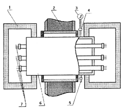 1 ¾ защитный кожух; 2 ¾ стена герметичного помещения: 3 ¾ манометр; 4 ¾ штуцер; 5 ¾ штуцер испытательный; 6 ¾ корпус; 7 ¾ токопроводящие жилы