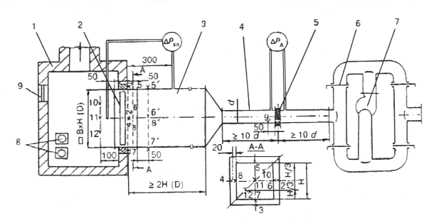 1 - печь; 2 - клапан; 3 - воздуховод; 4 - мерный участок воздуховода; 5 - сегментная диафрагма; 6 - регулирующая заслонка; 7 - вентилятор; 8 - форсунки; 9 - иллюминатор