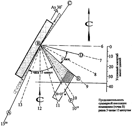 Продолжительность суммарной инсоляции помещения (точка В) равна 5 часам 15 минутам