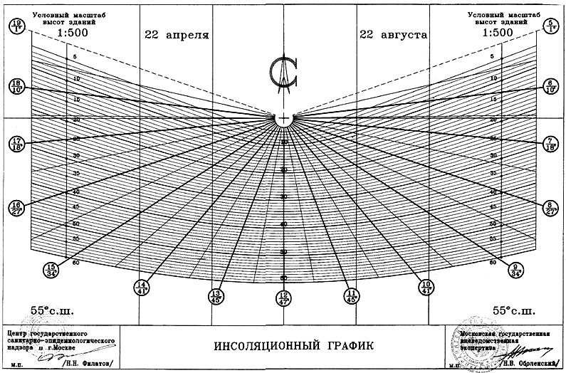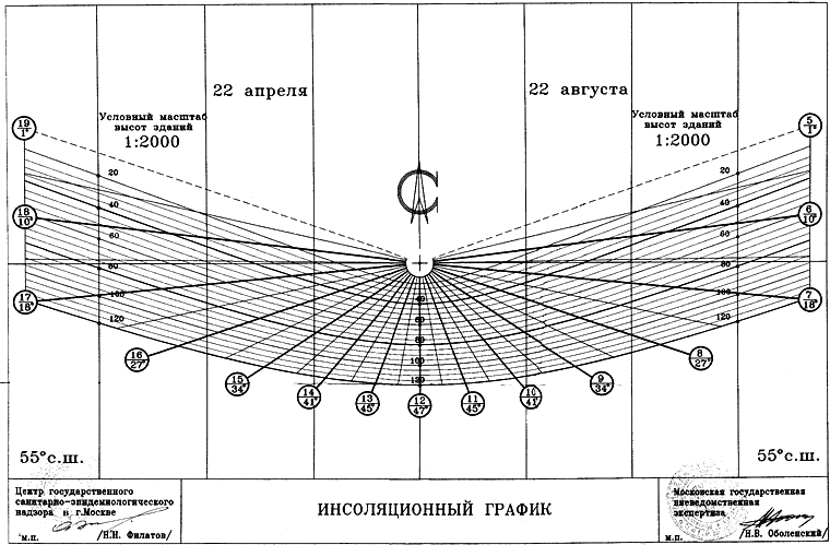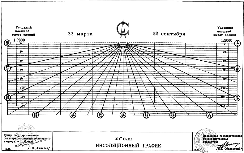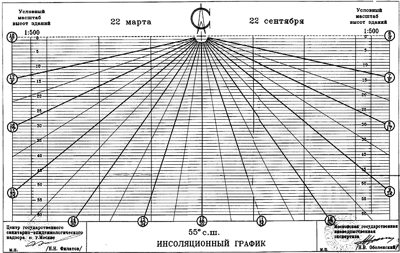 5.1. Расчет продолжительности инсоляции помещений и территорий выполняется по графикам (приложение Б), согласованным с ЦГСЭН в г. Москве и НИИСФ. Графики не могут быть размножены без согласования с НИИСФ.
