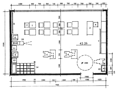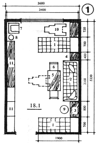 Рис. 11. Схема организации обеденного места в общей комнате при семейном проживании. Вариант 1 на 8 чел. Экспликацию оборудования см. рис. 10