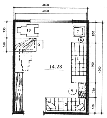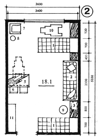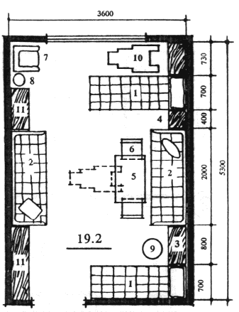 Рис. 1. Планировочная схема спальной комнаты на 2 места. (Вариант при шаге 3,6 м). Экспликация оборудования: 1 — кровать 190х70, 2 — диван 200х75, 3 — тумбочка 40х80, 4 — тумбочка 40х40, 5 — стол 60х100, 6 — стул 40х40, 7 — кресло 50х50, 8 — торшер, 9 — банкетка, 10 — инвалидная коляска, 11 — комбинированный шкаф