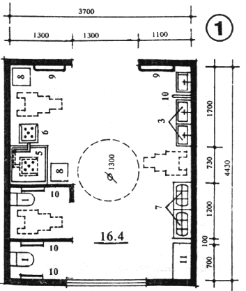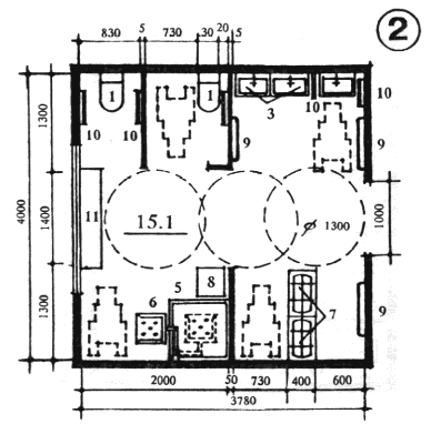 Рис. 8. Планировочная схема санитарного узла для дошкольных групп (вариант 2). Экспликацию оборудования см. рис. 7