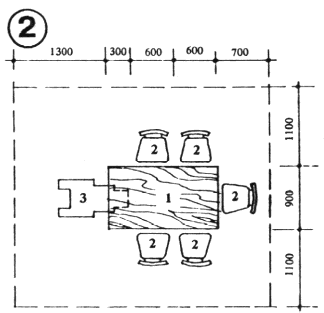 Рис. 12. Схема организации обеденного места в общей комнате при семейном проживании. Вариант 2 на 6 чел. Экспликацию оборудования см. рис. 10