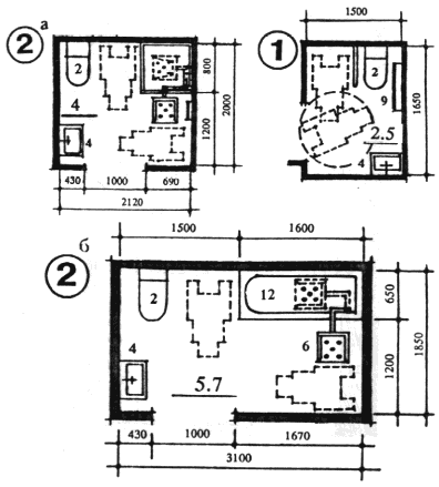 Рис. 6. Планировочные схемы санитарных узлов. Вариант 1 — уборная с умывальником. Вариант 2 — санитарный узел при спальной комнате. (а — вариант с душем, б — вариант с ванной). Экспликация оборудования: 1 — унитаз детский 30х50, 2 — унитаз для взрослых 40х60, 3 — умывальник детский 50х30, 4 — умывальник для взрослых 60х40, 5 — душевой поддон 80х80, 6 — поворотное кресло, 7 — ногомойка 40х60, 8 — банкетка 40х40, 9 — вешалка для полотенец, 10 — поручни-держатели, 11 — шкаф хозяйственный