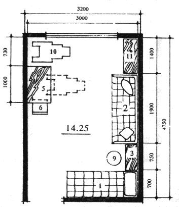 Рис. 2. Планировочная схема спальной комнаты на 2 места (вариант при шаге 3,2 м). Экспликацию оборудования см. рис. 1