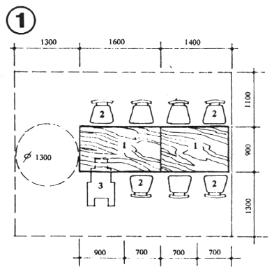 Рис. 10. Габаритная схема организации обеденного места в общей комнате при семейном проживании: вариант 1 — на 8 чел. Экспликация оборудования: 1 — стол, 2 — стул, 3 — инвалидная коляска