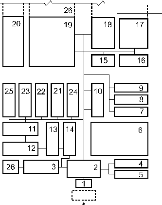 1- тамбур; 2 - вестибюль; 3 - помещение приема, регистрации поступления умерших и отправки урн с прахом кремированных; 4 - туалет для женщин; 5 - туалет для мужчин; 6 - траурный зал; 7 - комната начальника смены; 8 - комната отдыха операторов кремационных печей; 9 - комната приема пищи; 10 - санитарно-бытовые помещения; 11 - помещение обработки кремированных останков; 12 - помещение для пересыпки праха в урны; 13 - хранилище ненаполненных урн; 14 - хранилище урн с прахом; 15 - холодильная камера; 16 - помещение для холодильного агрегата; 17 - склад ремонтных деталей; 18 - помещение для нахождения гробов до кремации; 19 - кремационный зал; 20 - помещение для очистки газов и дымососов; 21 - венткамера; 22 - тепловой пункт; 23 - ввод водопровода; 24 - электрощитовая; 25 - ввод газа; 26 - резервный участок для расширения крематория; 27 - крытое пространство.