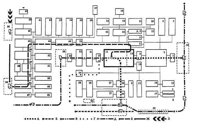 1 - тамбур; 2 - вестибюль; 3 - комната дежурного администратора и оформления документов; 4 - комната отдыха ведущего обряд прощания; 5 - комната родственников; 5-А - комната священника; 6 - комната оказания медицинской помощи; 7 - туалет для мужчин; 8 - туалет для женщин; 9 - шлюз; 10 - курительная; 11 - траурный зал; 12 - комната почетного караула; 13 - лестница на антресоли; 14 - музыкальная ложа; 15 - шлюз; 16 - комната отдыха музыкантов и хранения инструментов; 17 - помещение хранения реквизита; 18 - тамбур; 19 - вестибюль; 20 - туалет для женщин; 21 - курительная; 22 - туалет для мужчин; 23 - комната пребывания родственников у гроба до обряда прощания; 24 - курительная; 25 - шлюз; 26 - холл выхода; 27 - комната адаптации; 28 - помещение для воинского подразделения, назначенного в почетный эскорт; 29 - комната отдыха водителей автокатафалков; 30 - тамбур; 31 - помещение для временного сохранения умерших (в гробах), отправляемых в крематорий после обряда прощания; 32 - помещение для подготовки умерших к междугородной или к международной перевозке умерших; 33, 34 - тамбур рабочий; 35 - помещение приема и регистрации поступления умерших; 36 - шлюз; 37 - кладовая одежды, снятой с умерших; 38 - помещение санитарно-гигиенической и парикмахерской подготовки умерших; 39 - комната приема одежды и обуви для умерших; 40 - склад похоронных принадлежностей, предметов похоронного ритуала, одежды и обуви; 41 - охлаждаемая камера - хранилище венков, вазонов и букетов из живых цветов; 42 - помещение одевания, укладывания в гроб и косметической подготовки умерших; 43 - тамбур; 44 - охлаждаемые камеры для предпохоронного сохранения умерших; 45 - машинное отделение холодильных установок; 46 - помещение проверки и окончательной подготовки умерших перед обрядом прощания; 47 - комната психологической разгрузки персонала; 48 - комната приема пищи; 49 - гардеробный блок для женщин; 50 - гардеробный блок для мужчин; 51 - вентиляционная камера для 1-5 и 7 групп помещений; 52 - вентиляционная камера для рабочих помещений; 53 - тепловой пункт; 54 - ввод водопровода; 55 - электрощитовая; 56 - помещение санитарной обработки подъемно-транспортного оборудования; 57, 58 - крытое пространство; 59 - автостоянка; 60 - площадка для производства салюта.