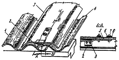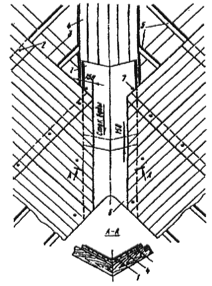 1 - лоток; 2 - гвоздь; 3 - лист; 4 - дощатое основание ендовы; 5 - брусок; 6 - сливной лоток;