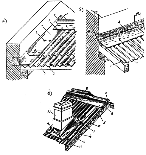 Рис. 16. Конструкция примыкания кровли из асбестоцементных волнистых листов к продольной (а) и поперечной (б) стены и устройство воротника дымовой трубы (в)