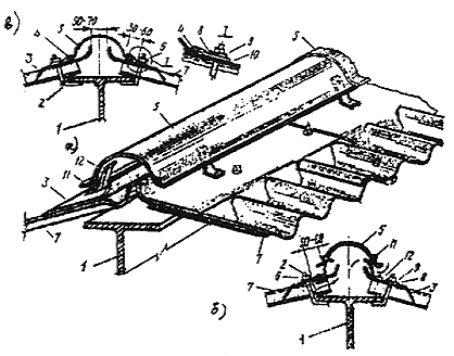1 - накрываемый край кровельного покрытия; 2, 5 - скобы; 3 - лотковая деталь;