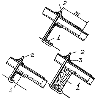 4.3.7. К прогонам асбестоцементные волнистые листы должны крепиться крепежными элементами типа "крюк" (рис. 15). Для рядовых листов используется, как правило, одно крепление на лист. В карнизных и коньковых листах, в рядовых листах при расчетной величине ветрового отсоса более 60 кгс/м2, а также при наличии кранов или технологического оборудования без устройства соответствующей виброизоляции должно быть предусмотрено одно дополнительное крепление на лист.
