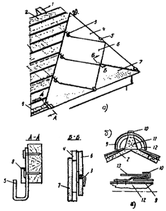 а) - продольный разрез ската; б) - крепление листов шурупами; в) - дополнительное крепление листов на карнизе. 1 - уравнительная планка; 2 - асбестоцементный лист; 3 - обрешеточный брусок; 4 - гвоздь; 5 - резиновая шайба; 6 - шуруп; 8 - гвоздь; 9 - противоветровая скоба