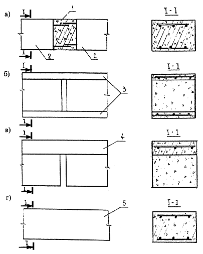 1 - монолитный бетон; 2 - сборные железобетонные блоки с выпусками арматуры; 3 - армированные пояса; 4 - железобетонный пояс; 5- монолитный железобетон.
