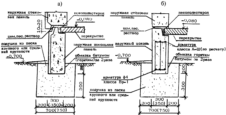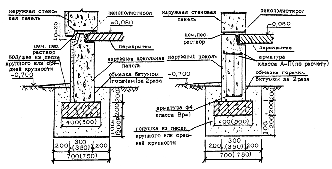 3. При строительстве панельных зданий на грунтах с расчетным сопротивлением R<0,15 МПа цокольные панели шириной менее 40 см следует устанавливать на мелкозаглубленные фундаменты из сборных железобетонных элементов (рис. 3). При